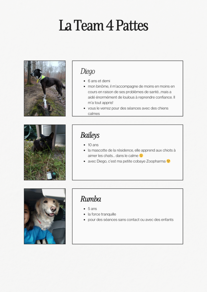La formation suivie au Centre du bien-être animal m’a permis d’acquérir des connaissances en accord avec mes valeurs : avec moi, vous ne verrez jamais de collier étrangleur/à pics, électrique ni d’a-coups sur la laisse.